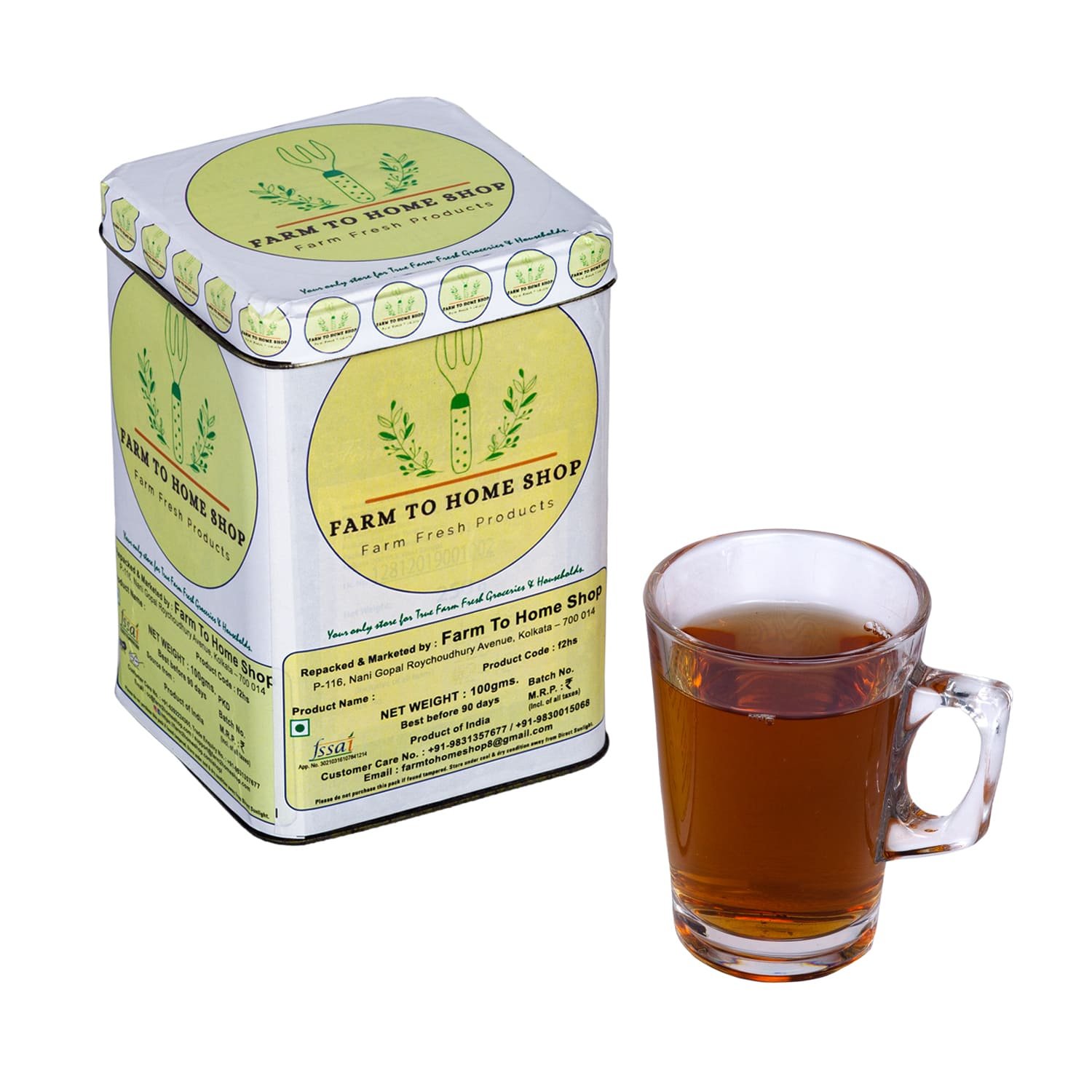 Savor the authentic taste of Farm To Home Shop Organic Tea Leaves (Chai Patti), presented in a beautifully designed, reusable tin. Sourced from certified organic gardens, these premium whole tea leaves are selected to provide a rich, full-bodied flavor and an invigorating aroma in every cup. Being organic ensures a pure and clean brew, free from harmful pesticides and chemicals, for a truly natural tea experience.
